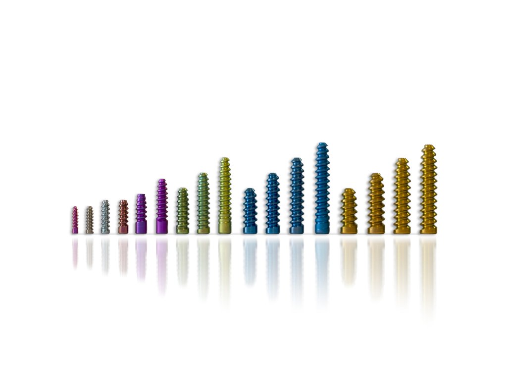 Interferenční šrouby představují nejvyšší standard kvality a jsou vyrobeny z titanu TA6V. Jsou eloxovány a označeny 6 barvami, aby bylo možné snadno identifikovat průměr.